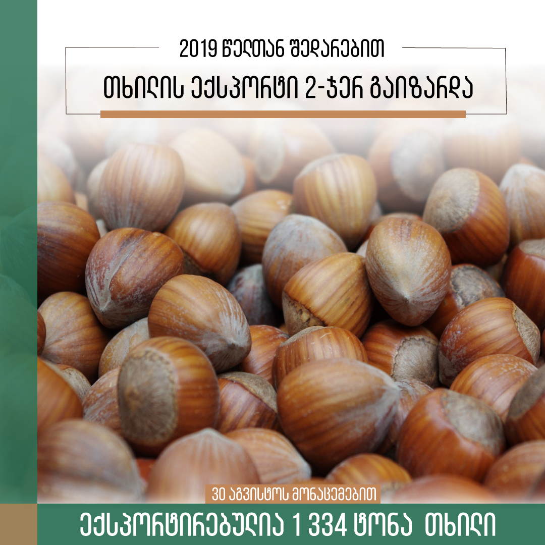 საქართველოდან 1 334 ტონა თხილია ექსპორტირებული, რაც ორჯერ აღემატება გასული წლის ანალოგიური პერიოდის მაჩვენებელს